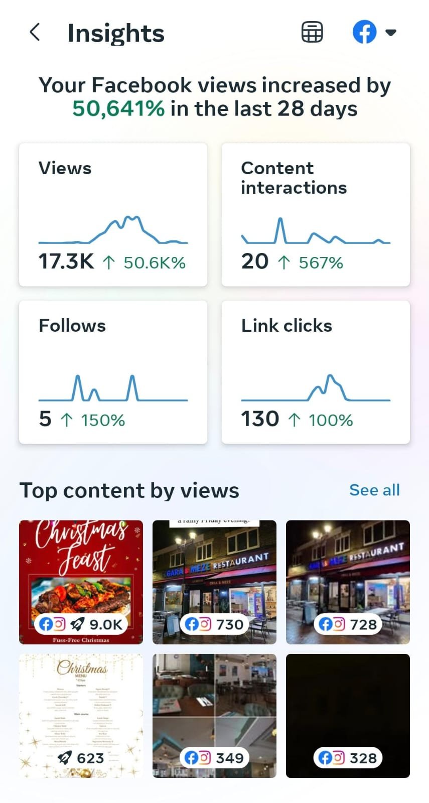 17.3K Facebook views (+50,641%) and 17.1K Instagram views (+2,940%).