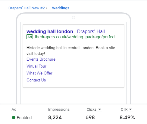 Delivered strong performance across search and display campaigns, aligned with distinct wedding and corporate event goals. The wedding search ad achieved an exceptional 8.49% CTR, while display campaigns generated large-scale awareness with above-benchmark engagement — including 3,600 clicks for weddings and 17,000+ clicks for corporate events. These campaigns effectively attracted highly relevant traffic and amplified venue visibility.