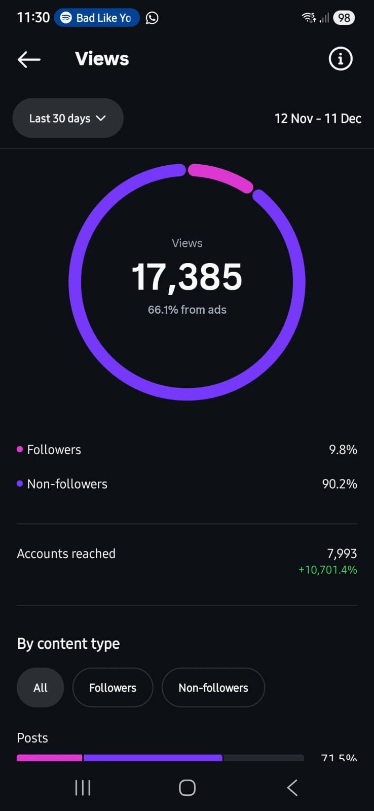 Grew a new account from scratch to 17K+ monthly views across Instagram and Facebook, with over 10K% increases in reach. Content drove strong visibility among non-followers, generating 635+ interactions and 470+ link clicks. Top posts consistently reached thousands, establishing rapid early traction and strong audience discovery in under 30 days.
